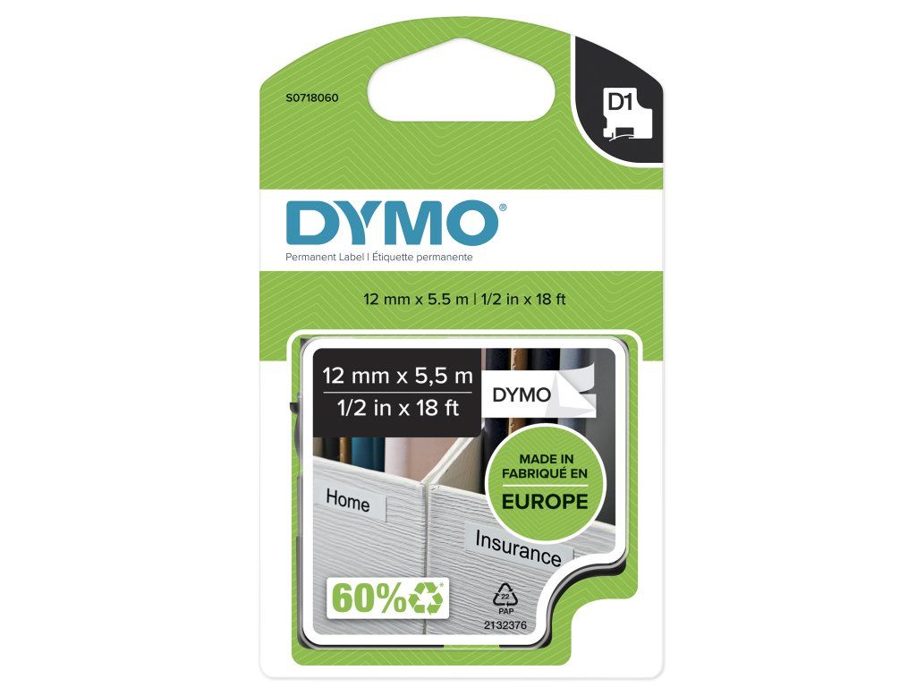 D1-TAPE POLYESTER 12MM X 5.5M/BLACK ON WHITE